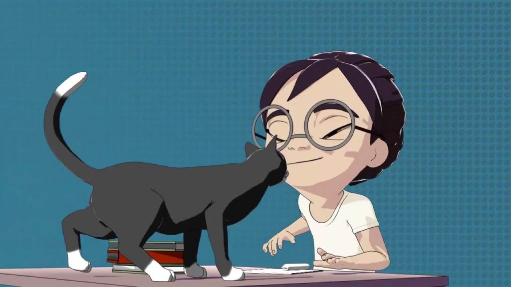 八歳児くらいの女の子が野良猫を追いかけるアニメーションです。このアニメーションでは女の子も猫も両方可愛く思って欲しかったので、女の子が頑張って追いかけるんだけど、それを猫は颯爽と躱して。でも最終的には猫の方から女の子にすり寄る。両方の愛らしさを表現できるよう考えたアニメーションです