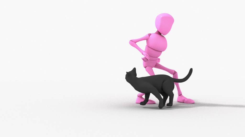 女の子の感情を伝えられるようポーズ・動きを作りました。猫の可愛さに心躍り、逃げられてショック・悔しい…といった感情を女の子っぽいポージングで伝えらえるよう心掛けて制作しています。猫の方は、犬などに比べて気まぐれなイメージがあるので、簡単にはなびかない…かと思ったら全力でじゃれついて来るといった、猫っぽさを出すよう心掛けました。