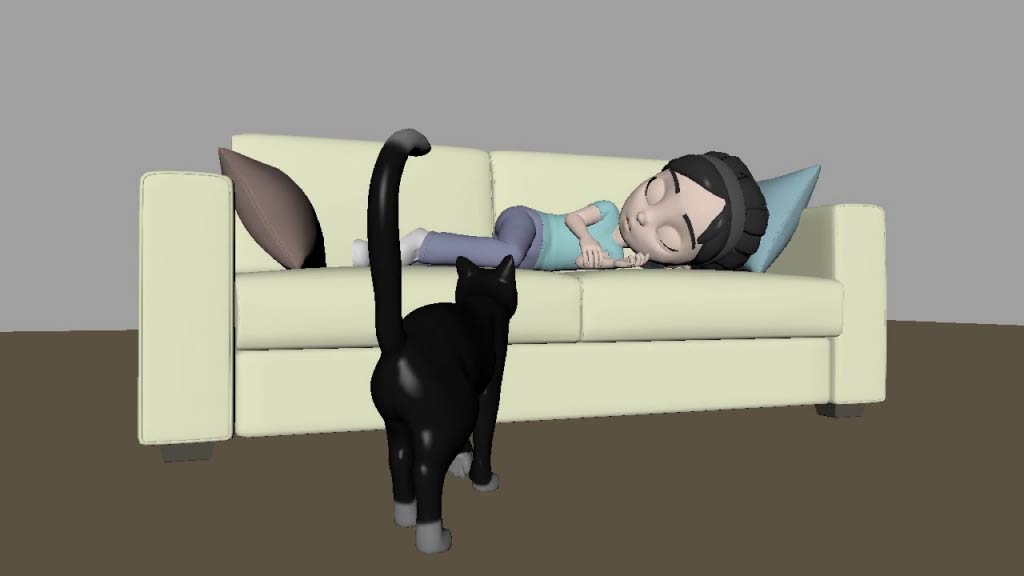女の子に起きてかまってほしい猫の可愛さ、猫のことが大好きな女の子の可愛さ、猫と女の子の家族と同じ信頼関係の良さを意識して、アニメーションを付けました。猫が女の子に近寄る動きや、女の子が猫とじゃれあうリアクションで猫と女の子が相思相愛であることが視聴者の方に伝わるように、一つ一つのポーズや表情に気をつけながら制作いたしました。