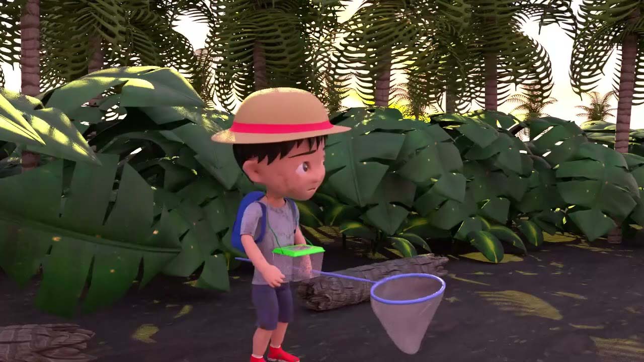 作品内容は,少年がモルフォ蝶という世界で一番美しいと言われるチョウを図鑑で見て,「捕まえに行くぞ!」という形で始まります。なかなか頑張っても見つけられずがっかりしていたら,チョウが肩越しに止まって,びっくりして,チョウを追いかけて最後に捕まえて大喜びするという内容です。